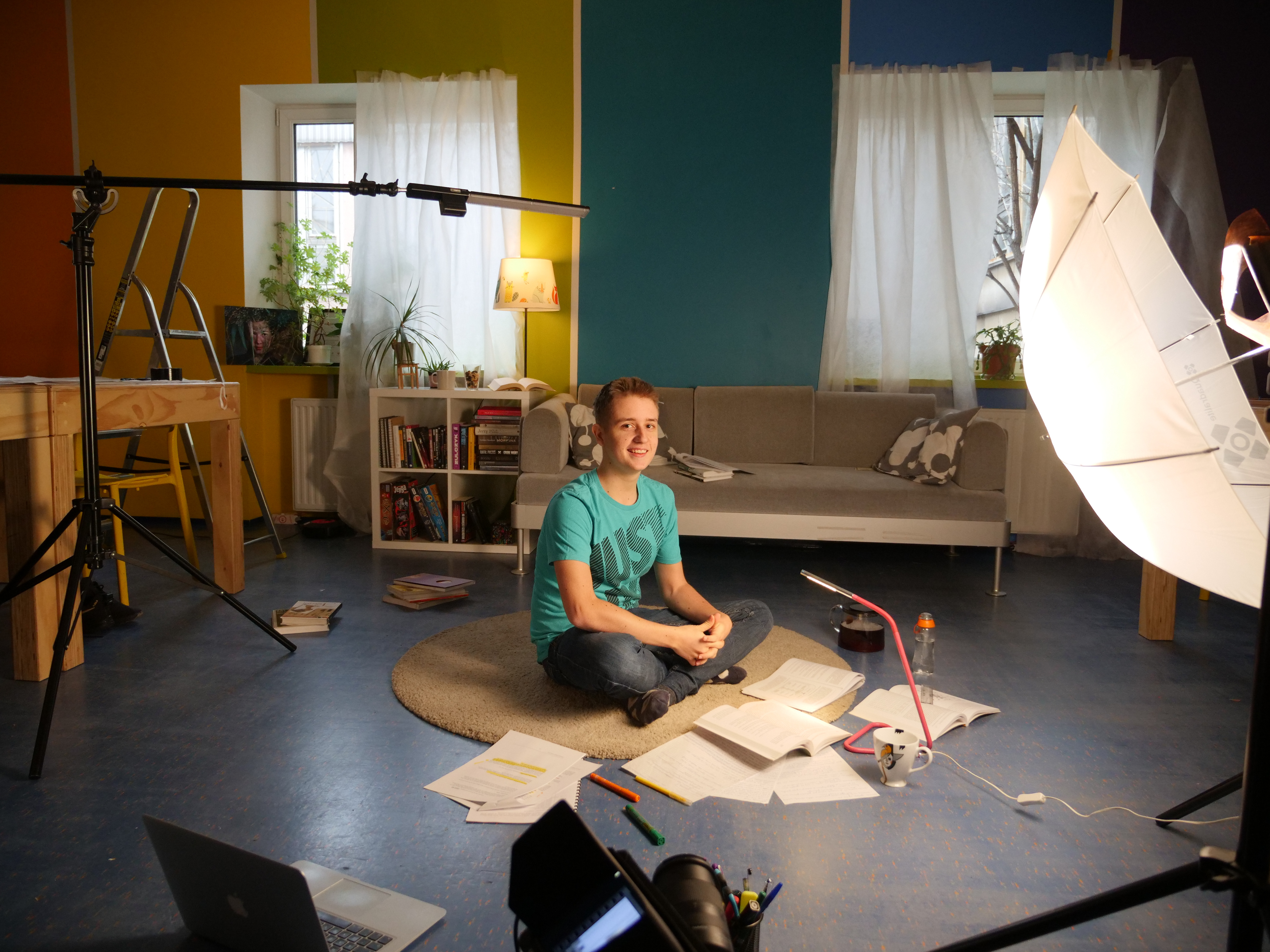 Realizacyjne chcieliśmy zamienić przestrzeń biurową w symulację prywatnych pokojów naszych bohaterów. Do tego celu wykorzystaliśmy różne kolory ścian, salonowe meble i akcesoria, które nawiązywały do zainteresowań dzieci.