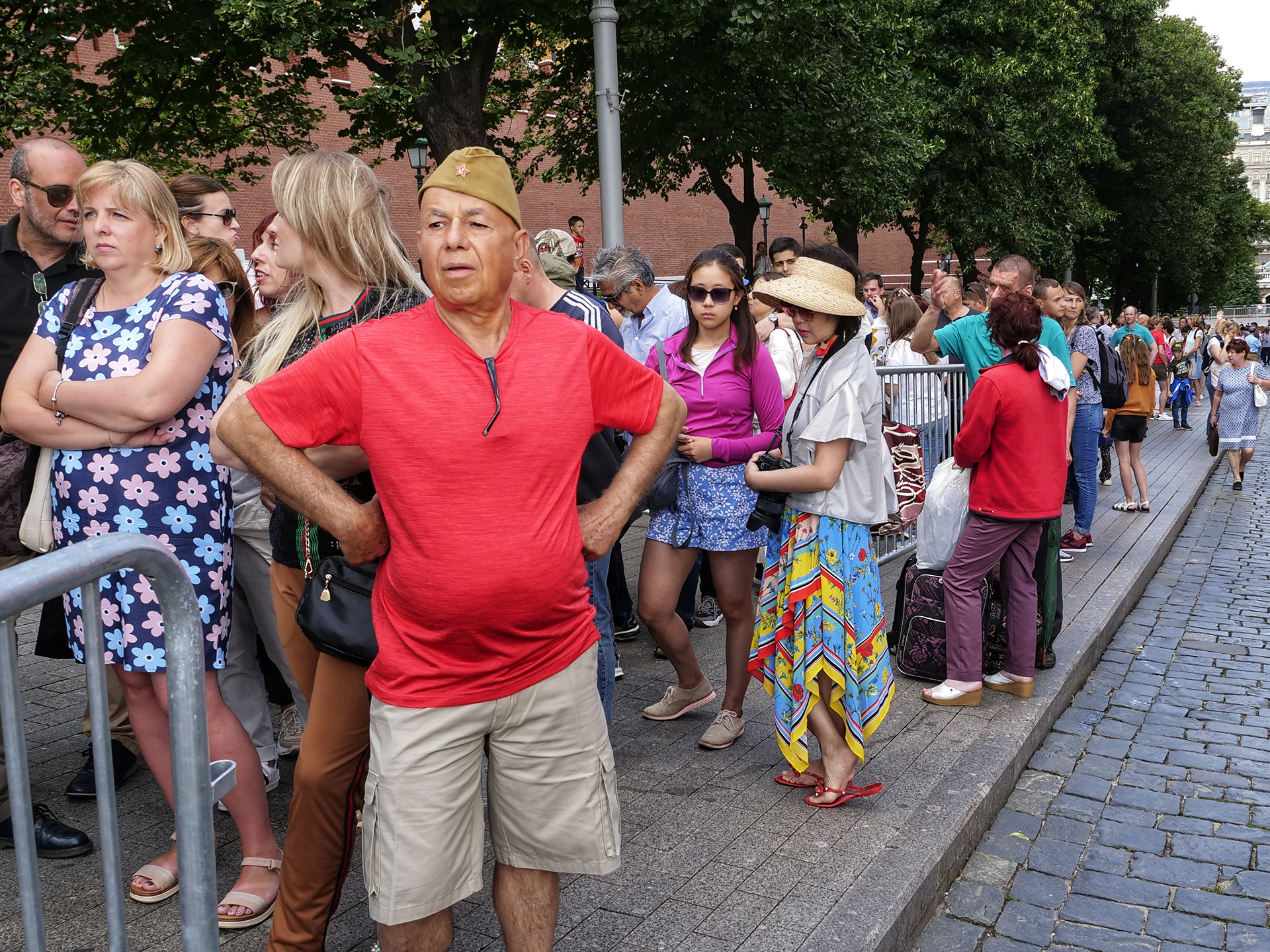 Kolejka zakręca przy murach Kremla, potem biegnie wzdłuż fortyfikacji przez Plac Czerwony aż dociera do otwartych, żelaznych wrót mauzoleum.
